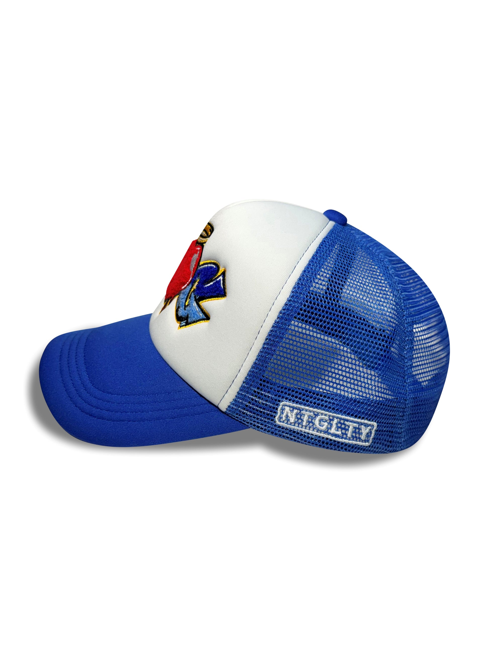 Classic Snapback Foam Trucker Hat by NTGLTY, features chenille embroidery " Innocent Broken Heart" NG on the front and the iconic embroidered logos on either side, breathable blue mesh back, and adjustable snap panel.