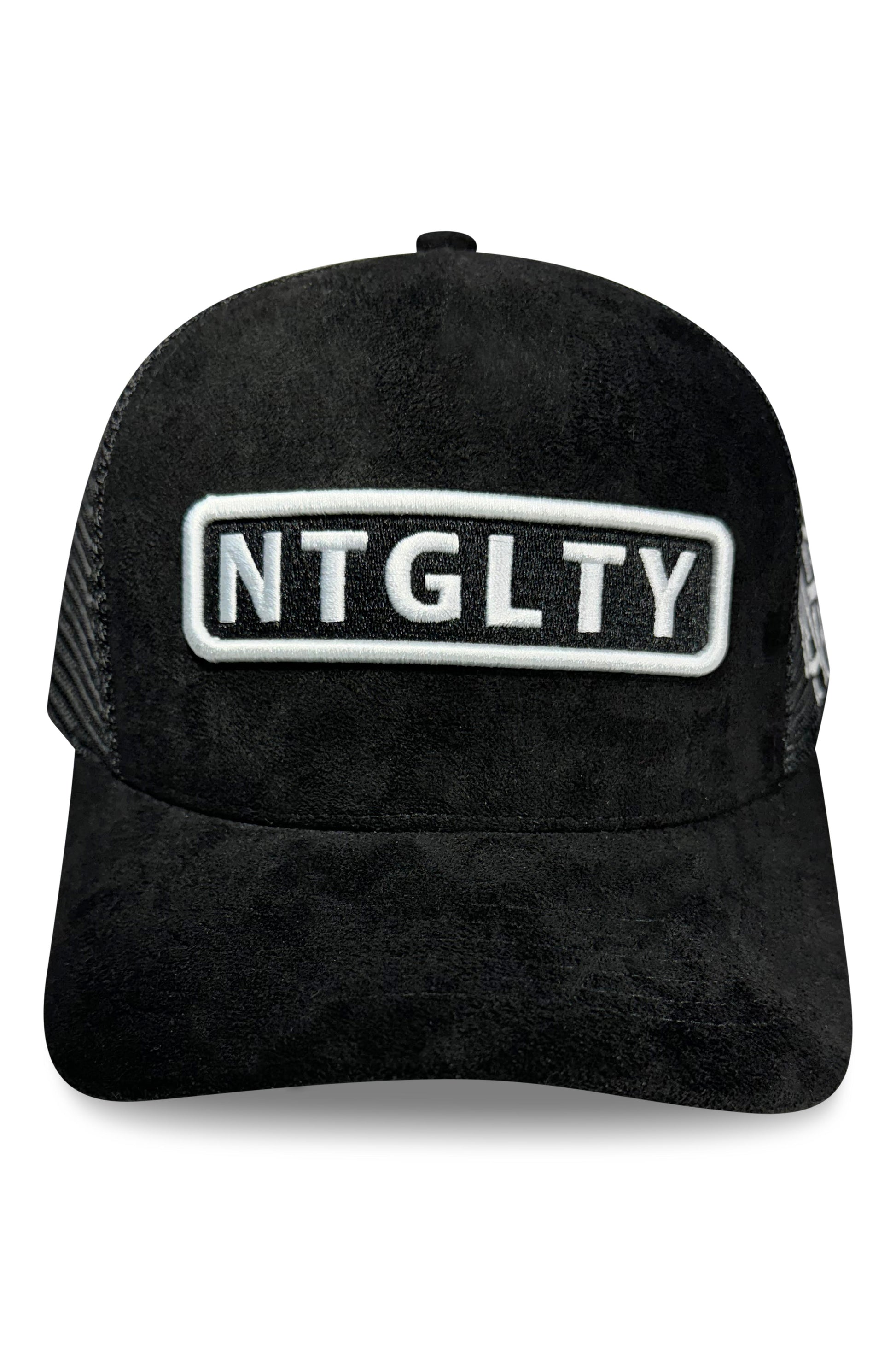The NTGLTY Black Suede Classic Snapback features a 3D embroidered NTGLTY logo on the front suede panels, an embroidered NG monogram on the left-wear side, breathable mesh back panels, adjustable snapback