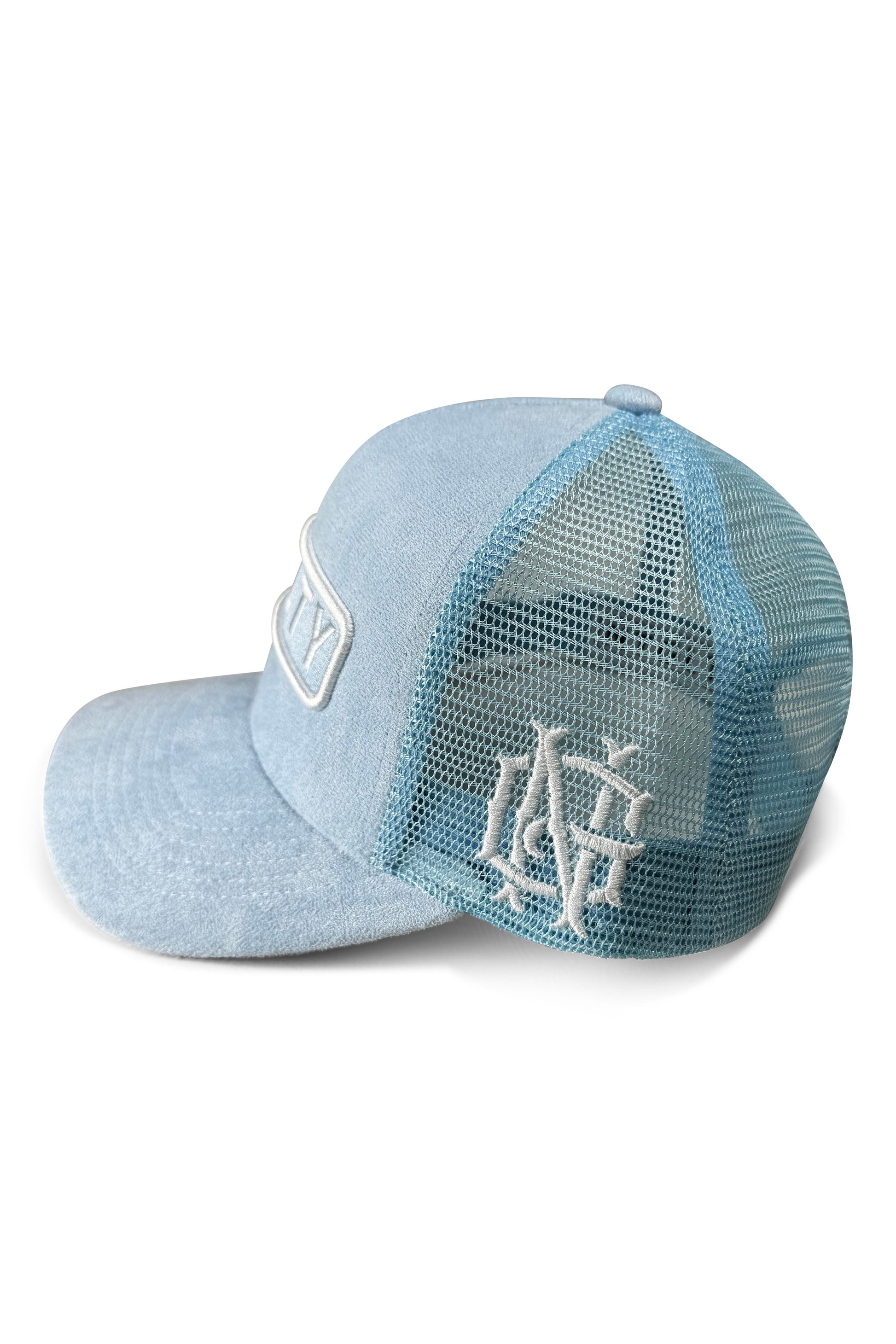 The NTGLTY Light Blue Suede Classic Snapback features a 3D embroidered NTGLTY logo on the front suede panels, an embroidered NG monogram on the left-wear side, breathable mesh back panels, adjustable snapback