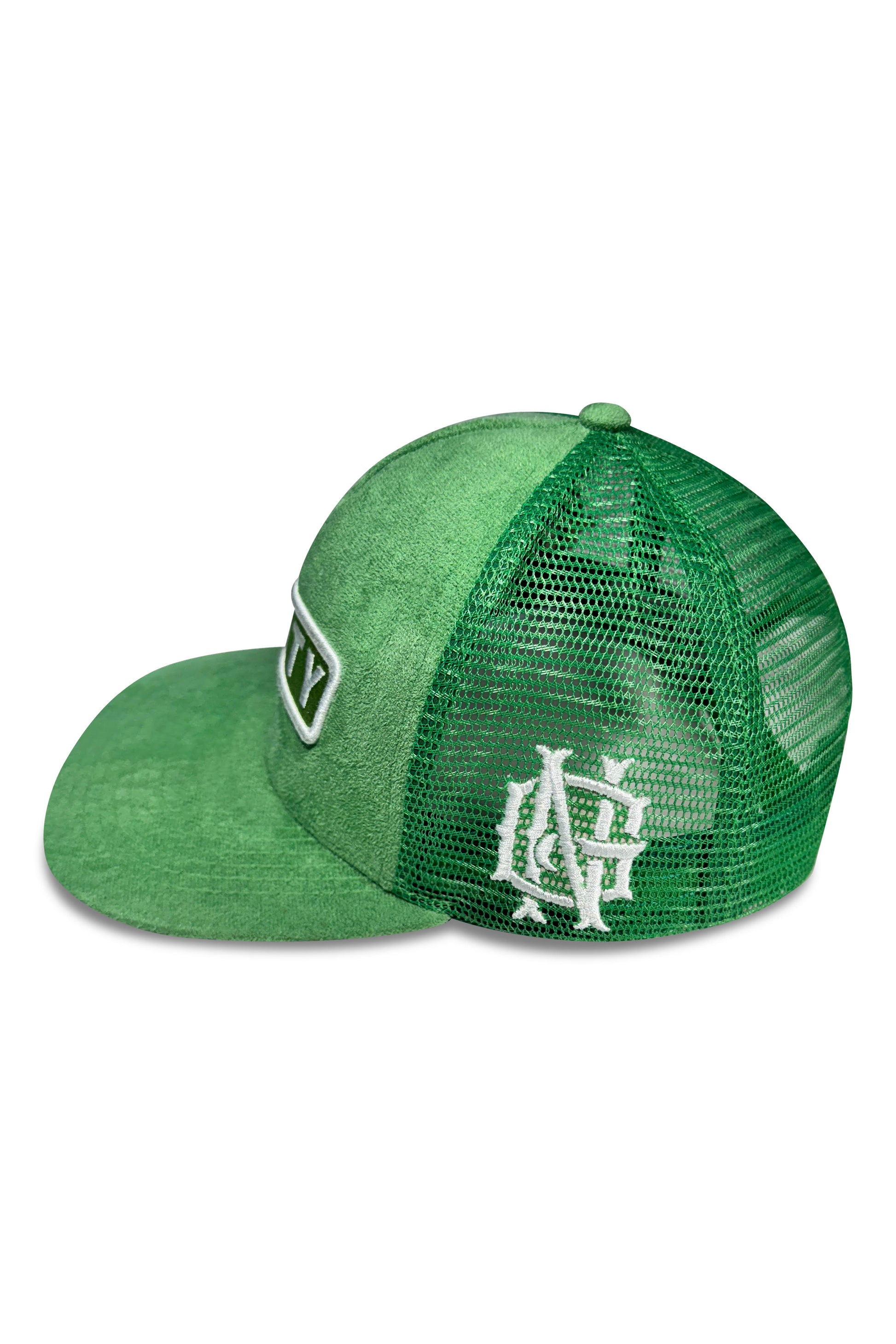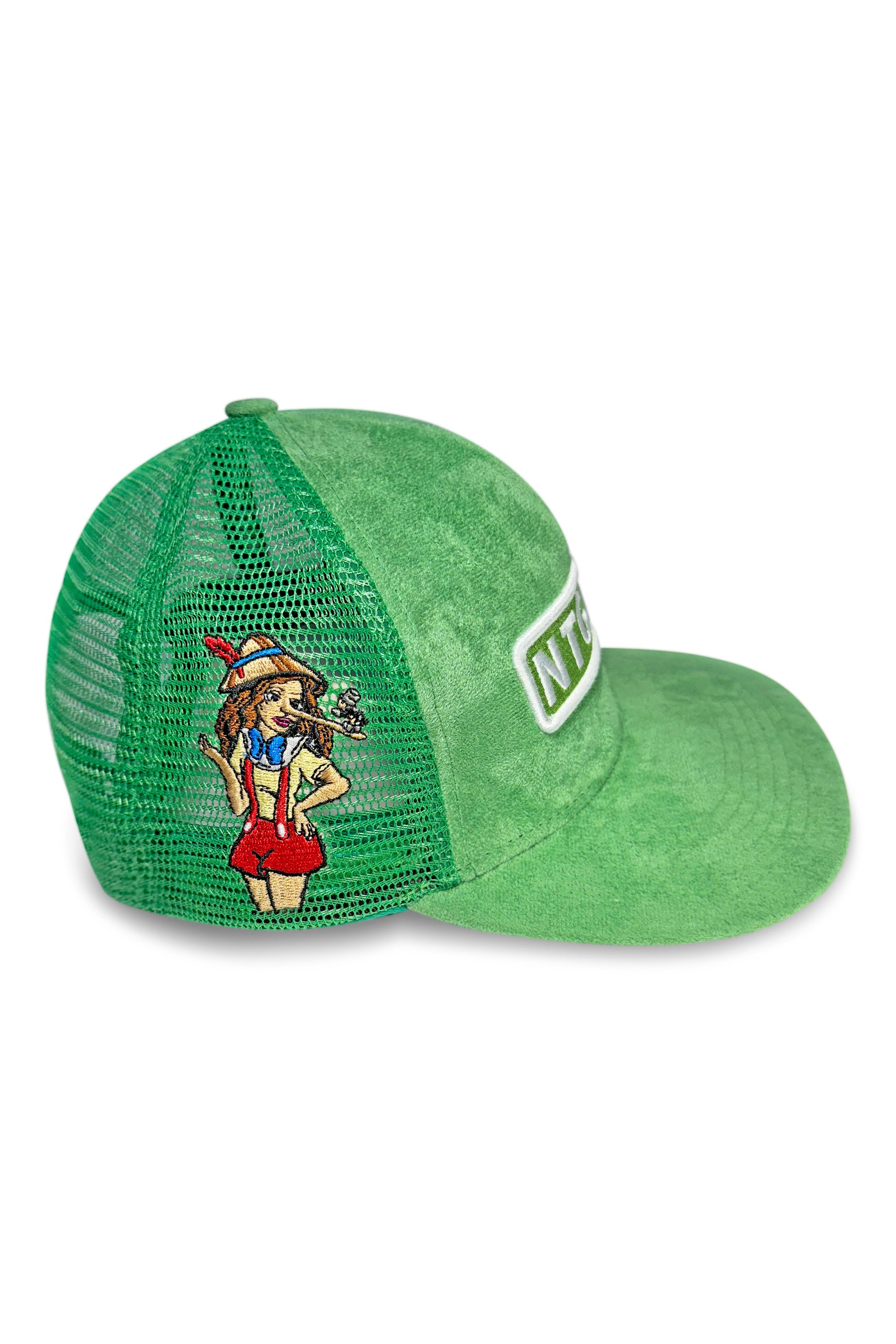 The NTGLTY Green Flat Brim Snapback features a 3D embroidered NTGLTY logo on the front suede panels, an embroidered NG monogram on the left-wear side, and the original "Lies" character on the right-wear side, breathable mesh back panels, adjustable snapback