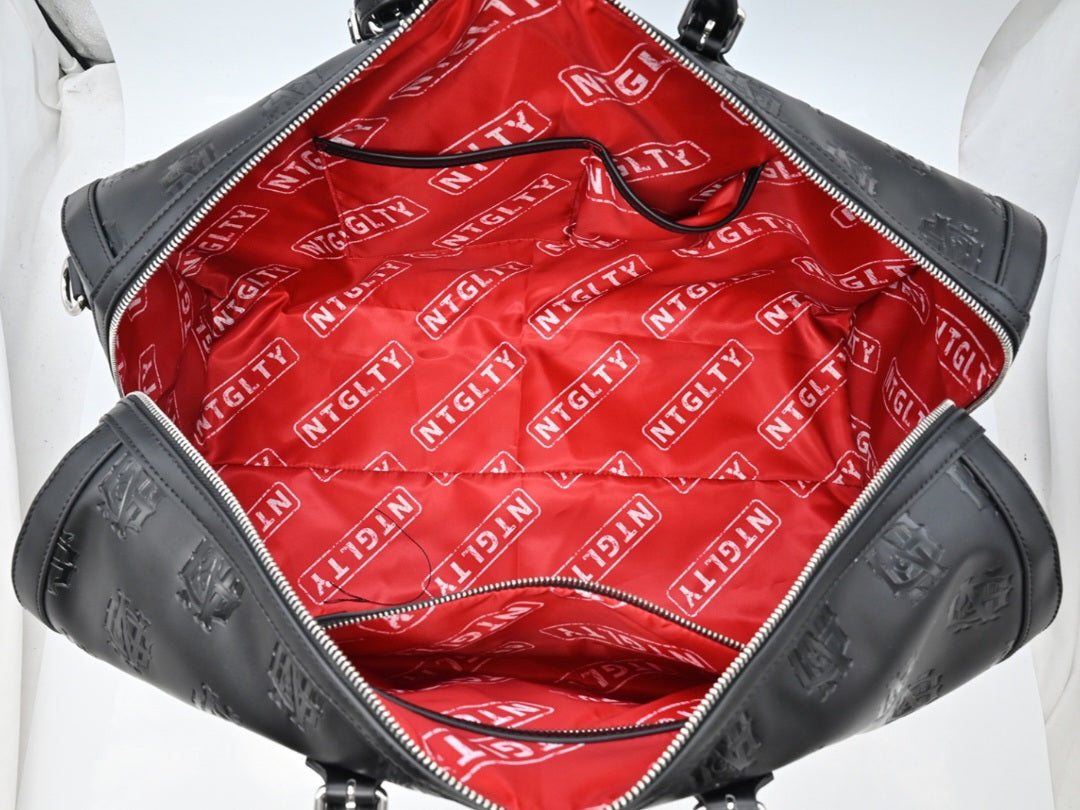 This black PU leather travel bag features an embossed NG monogram and is lined with a red polyester featuring a NTGLTY logo. The luxurious feel and quality of this bag make it an ideal choice for your everyday carry-all.